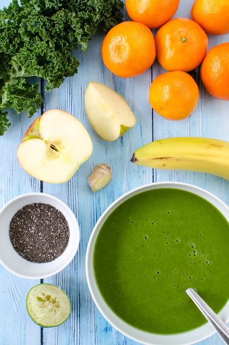 Ingwer, Chia-Samen, Steinsalz, Limettensaft und Wasser hinzufügen. Auf höchster Stufe zwischen 40 bis 60 Sekunden mixen.
